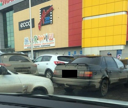 Например, один из пользователей прислал фотографии, сделанные около торгового центра «МART». Двое водителей установили на автомобиль «шашку» такси и припарковались, мешая проезду остальных участников дорожного движения.