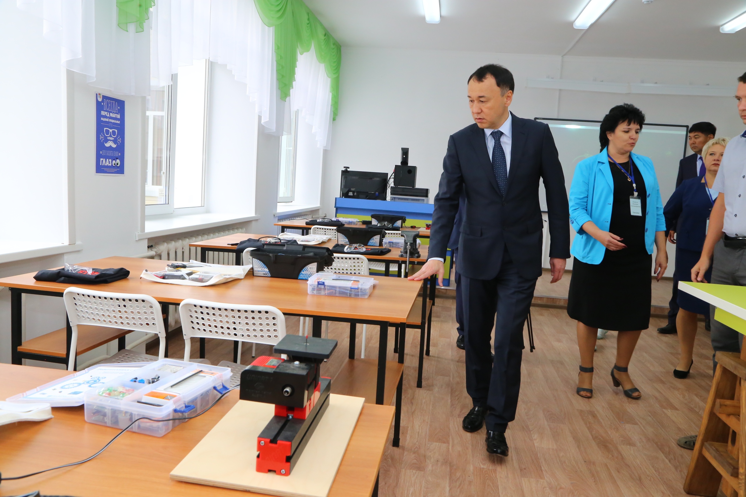Далее глава региона направился в среднюю школу №4. Она была построена в 1974 году. В 2017-ом здесь закончили капремонт стоимостью более 470 миллионов тенге.