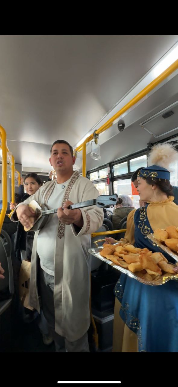 В рамках инициативы молодёжь угощала пассажиров городских автобусов горячими баурсаками, создавая праздничное настроение и атмосферу единства.