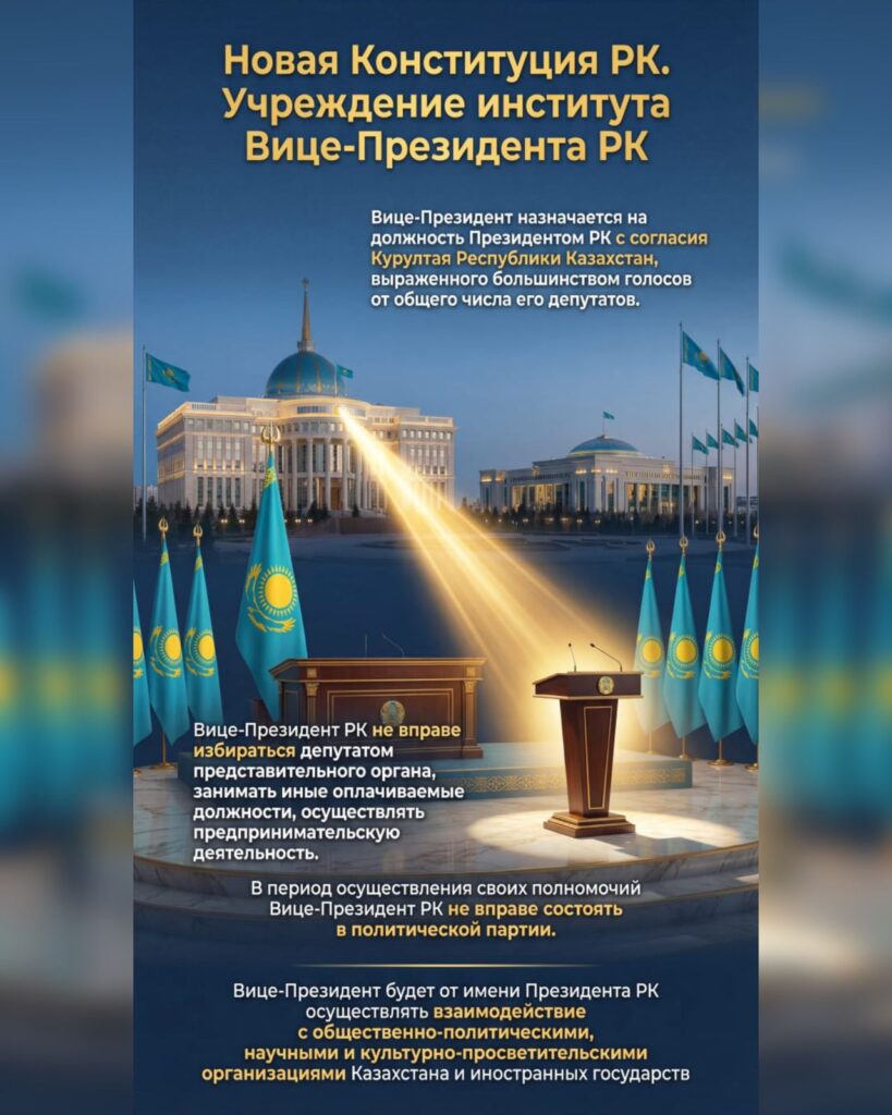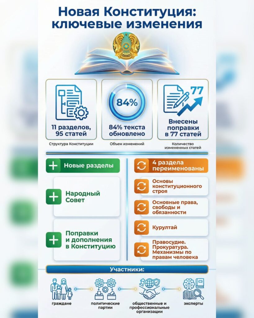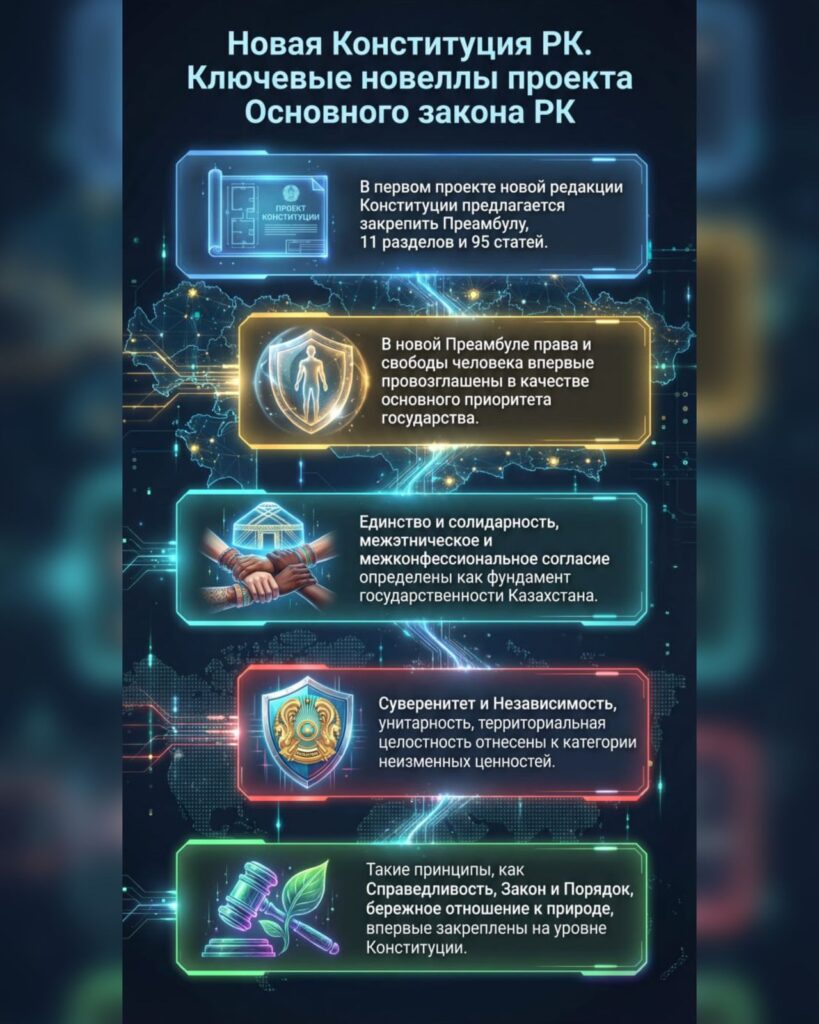 Ключевые новеллы проекта Основного закона РКАвтор: Редактор | Политика01.02.2026 в 13:29 01.02.2026 от Редактор Просмотров: 34 Мне нравится - Похожие новости«Покажи мне свою Конституцию – и я скажу, в какой стране ты живёшь»01.02.2026 14:16В сети распространяется ложная информация о запрете на продажу земель иностранцам31.01.2026 17:42Доходы от национальных ресурсов направляются в поддержку будущего поколения31.01.2026 15:20Нерушимость границ и единая нация: что предлагают вписать в преамбулу Основного закона31.01.2026 14:14«Судьбоносное для Казахстана время»: президент высказался о Конституционной реформе30.01.2026 15:00Норма об унитарности государства, целостности, неприкосновенности и неотчуждаемости территории Казахстана остается неизменной – Конституционная комиссия29.01.2026 13:10