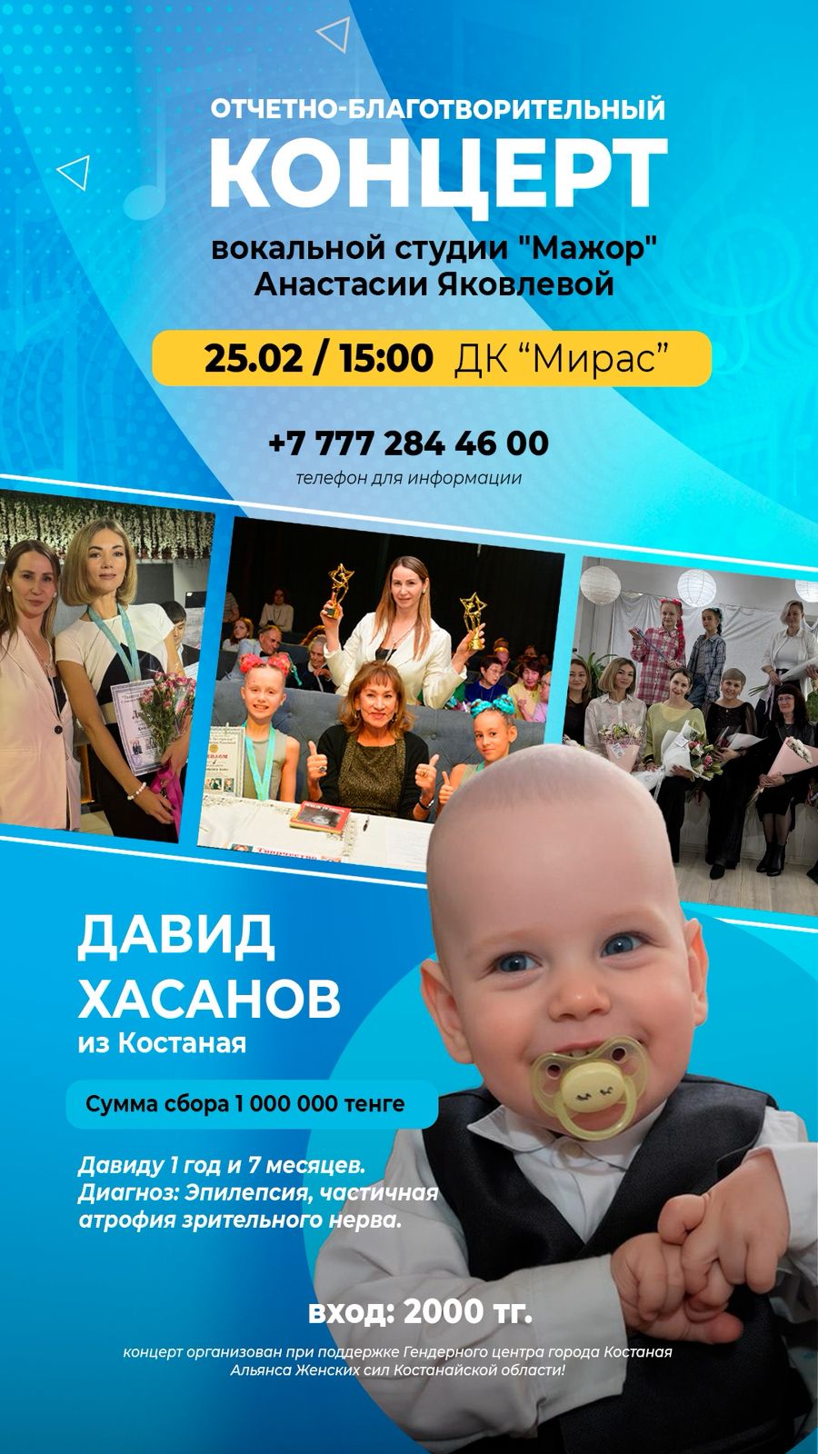 25 февраля в ДК «Мирас» пройдет благотворительный концерт, который организует руководитель вокальной студии «Мажор» Анастасия Яковлева при поддержке Гендерного центра города Костаная Альянса Женских сил Костанайской области. Все собранные деньги будут переданы для ребенка проекта «Жизнь на ладони» Давида ХАСАНОВА из Костаная.