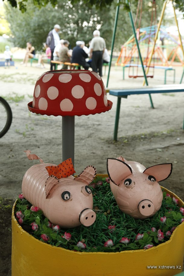 …Обходим двор. На клумбах ни травинки, яркие краски, масса милых ландшафтных штук — пальмы, лебеди, грибы, божьи коровки, ягоды и яблоки… И все это из бросового материала. К примеру, на гирлянды из колокольчиков пошли бутылки из-под тана — жильцов просила, чтобы не выкидывали, а ей приносили. Идеи Лариса черпает в Интернете, сама дополняет деталями – не любит, чтобы как у всех было. Искусственные цветы у нее во дворе перемежаются с живыми. Вот подходим к набирающим цвет гладиолусам…