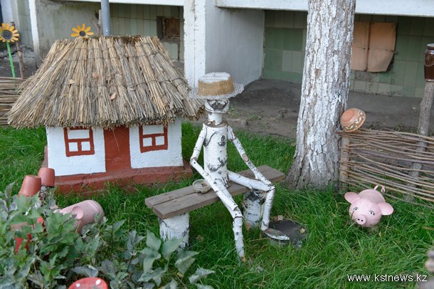 Честно говоря, сюда мы ехали, не подозревая о трагичной подоплеке создания этой красоты. Нам просто рассказали, что есть такой двор в девятом микрорайоне Костаная. Он действительно ТАКОЙ. В каждой мелочи – необыкновенная забота. На стволе сосны, к примеру, цветы и кукла – как будто человечек вскарабкался. На стене гаража – море и дельфины. Это все уже делала Любовь Жерло.