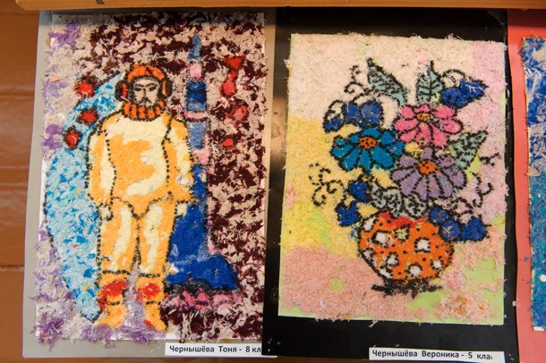 Галина Борисовна улыбается – это еще не все уместилось. Приглашает нас в выставочный зал – гордость школы. По пути рассказывает, что ведет два кружка – в одном собираются юные художники, другой для ребят, которые как раз осваивают разные техники, учатся из отживших век вещей делать чудо своими руками.