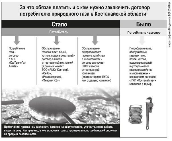 Не будем вдаваться в подробности, должен ли был при таком раскладе уменьшиться тариф и насколько. Материал не про это. И не про то, является ли детищем АО «КазТрансГаз Аймак» компания, которая первая вышла на рынок с предложением обслуживать газопотребляющие системы – ТОО «РЦКУ-Костанай». Речь идет о том, что сегодня потребитель обязан заключать отдельный договор на обслуживание личного газового хозяйства (плиты, печи). А в случае, если вы живете в многоэтажке, нужно платить и за обслуживание общедомового газового хозяйства. Иначе поставщик имеет право перекрыть доступ к услуге. Кстати, сегодня у ТОО «РЦКУ-Костанай» уже три конкурента – ТОО «СеКо», «Ремгазсервис», «Энергия KZ».