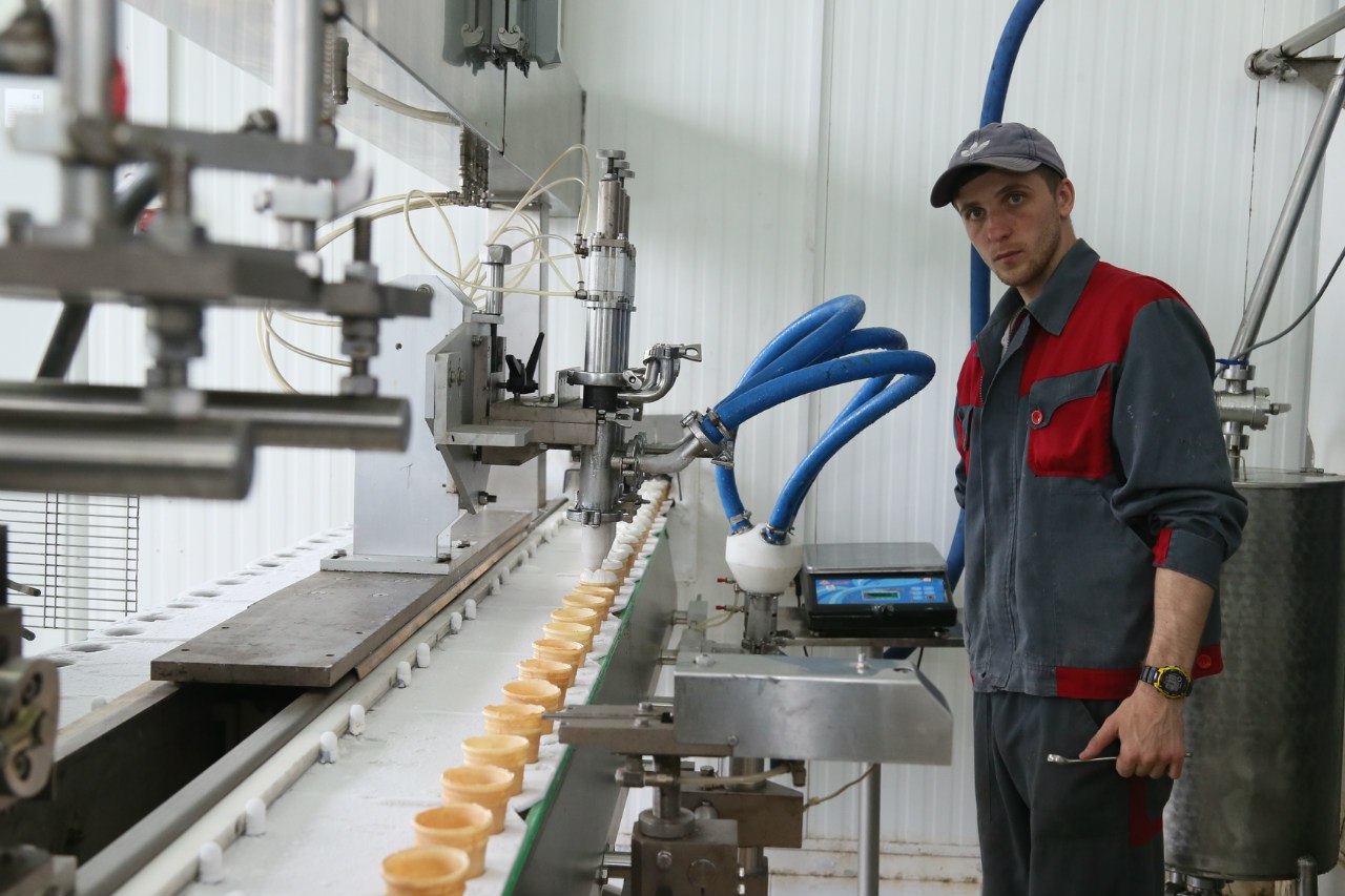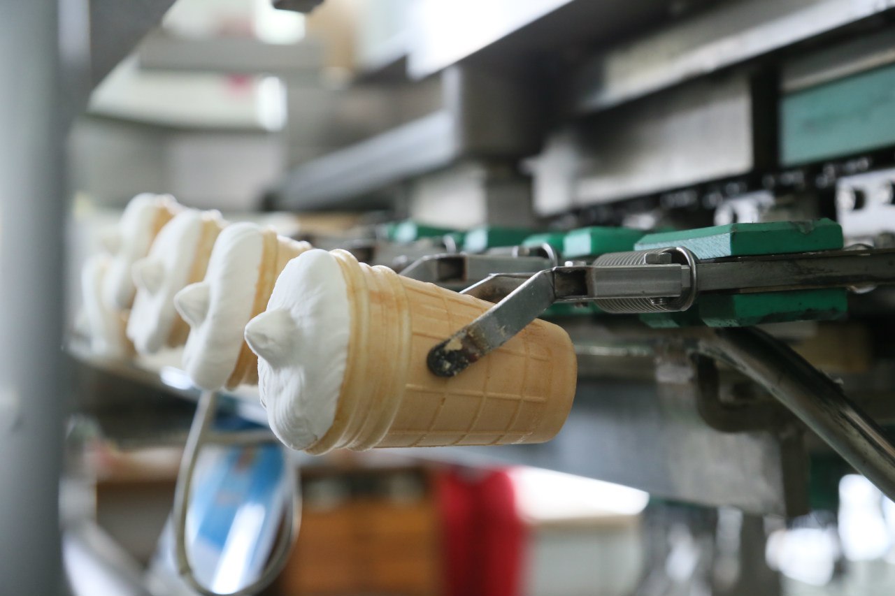 Всё выше перечисленное смешивают в специальной машине. Потом массу оставляют «дозревать» на четыре часа и лишь после этого пускают ее на фасовочную линию. А тут все как на картинке: мягкая пушистая смесь заполняет движущиеся по линии вафельные стаканчики. Их, кстати, пекут тут же на предприятии.