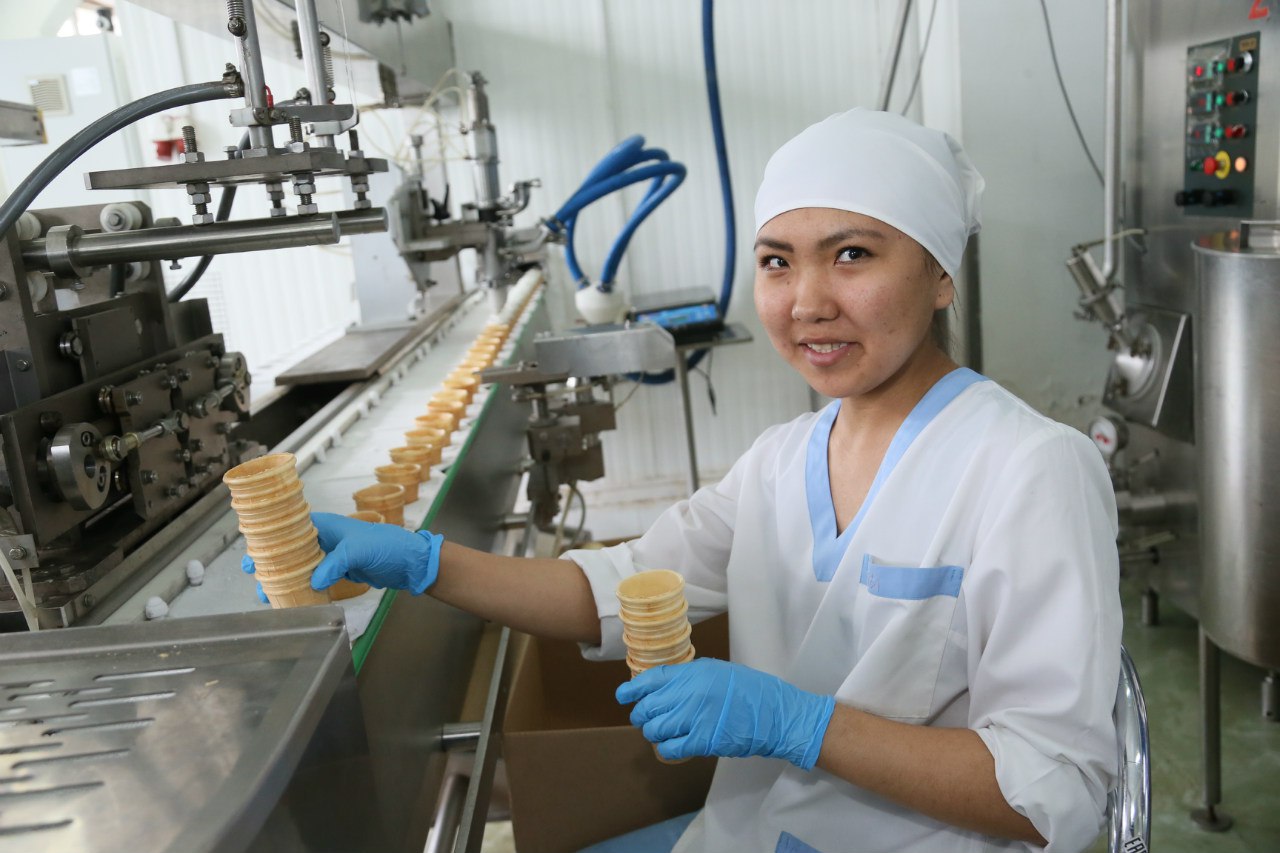 К слову, в летний период в этом цехе производят около 9-9,5 тонн мороженого ежесуточно. Зимой этот объем уменьшается вполовину. В общем, анекдоты анекдотами, но даже в морозы мы не отказываемся от этого лакомства. И все оно съедается. Треть от этого объема — мы, остальное уходит в другие регионы Казахстана и даже в Россию. Как раз, когда мы снимали репортаж, из службы сбыта пришел молодой человек и сказал, что Челябинск после пробных партий требует фуру мороженого.