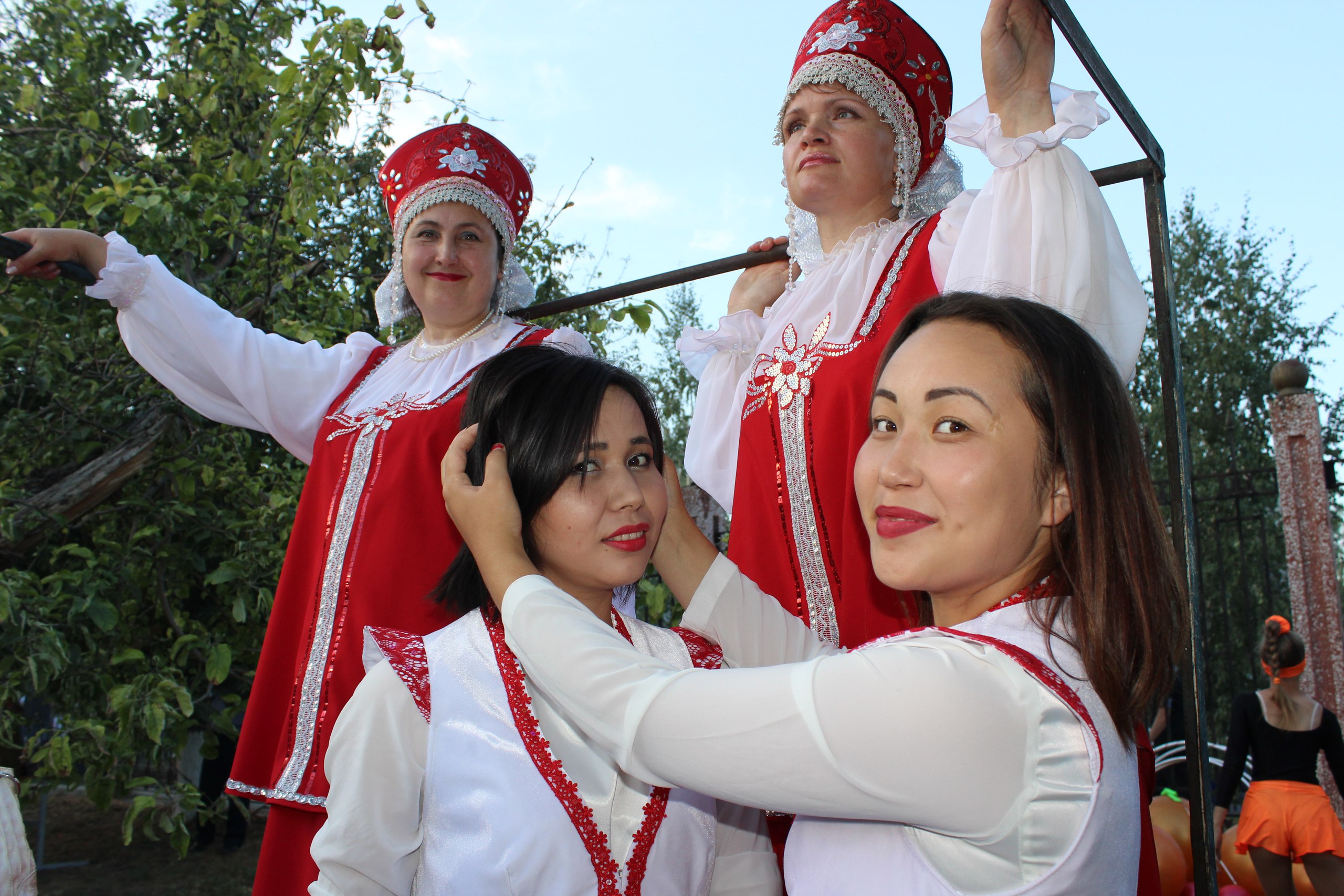 «Закулисье» стадиона стало одним большим репетиционным залом. Под каждым деревцем, словно у балетного станка, танцоры тянули ножку. У каждого куста распевались солисты. А музыканты прямо на траве настраивали инструменты.