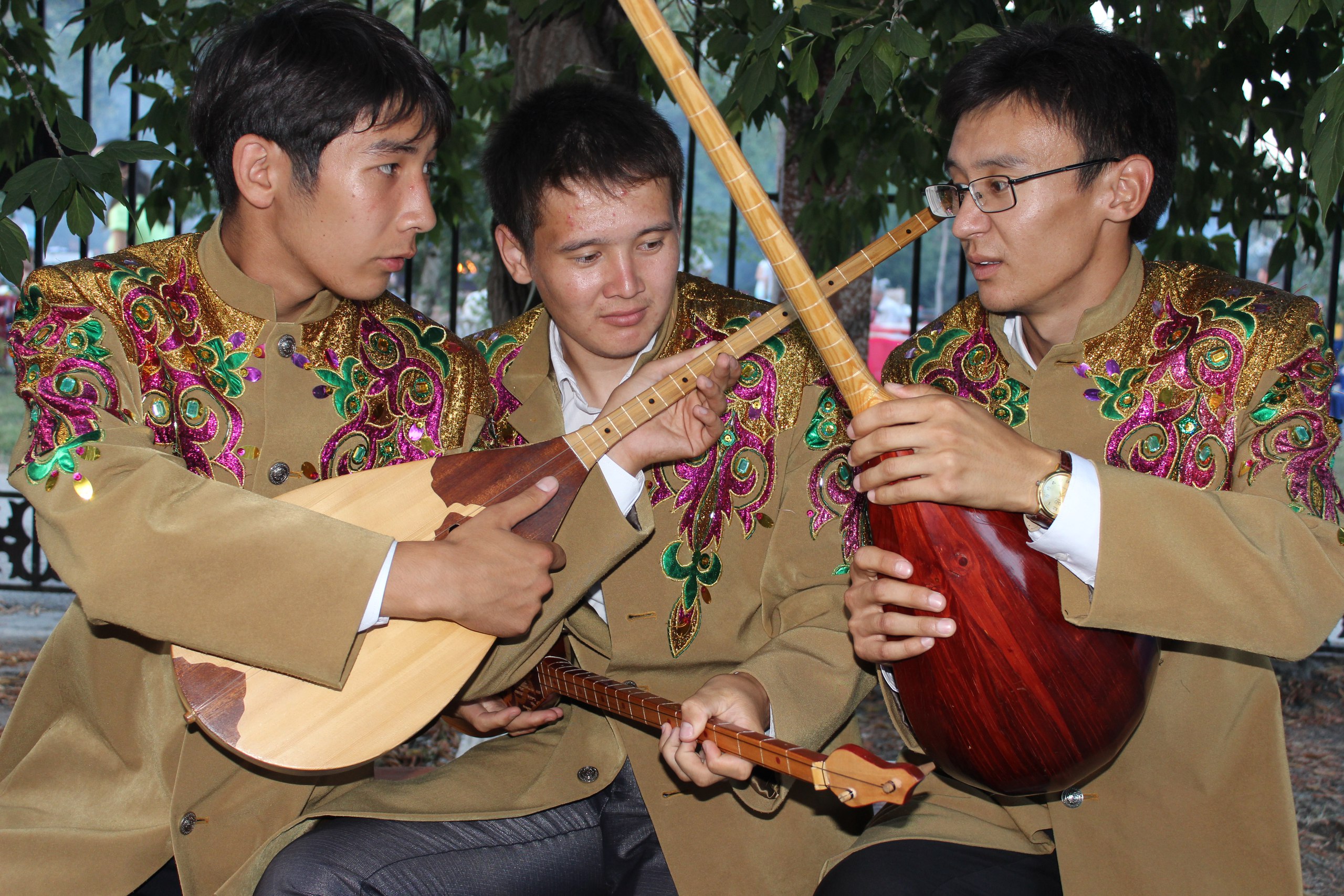 Рядом зазвучал голос степей – по струнам домбры ударили музыканты ансамбля «Жетыколь» из Аулиекольского района. Братья Какимовы играют на домбре с детства, вместе и в музшколе учились. «Репетируем кюй о Родине!» – пояснил Арман, один из братьев.