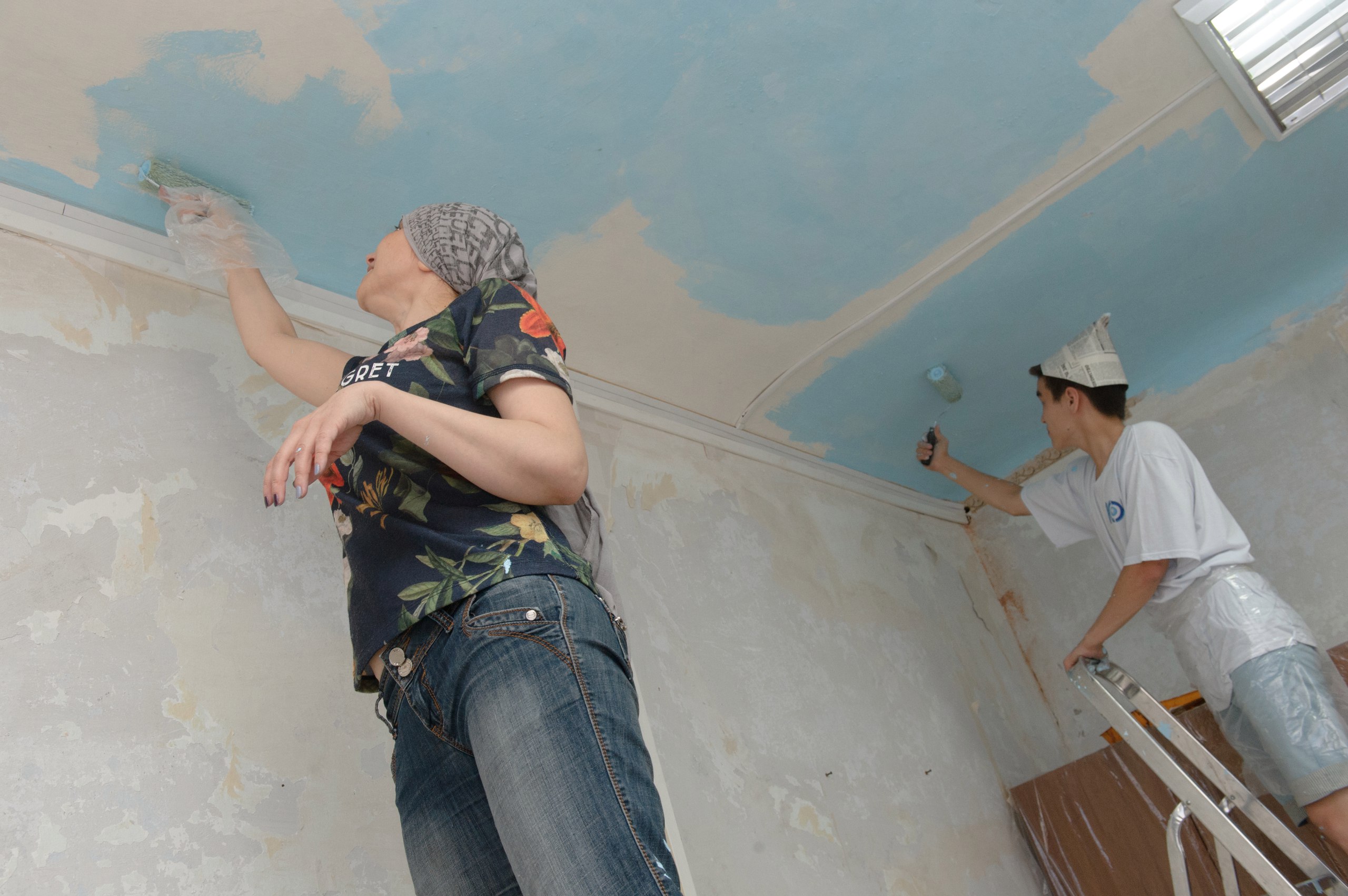 Парни смеются. Им нравится Фарид, по душе суровые шутки фотокорреспондента Константина Вишниченко, футболки и причастность к общему делу. Правда, превращать потолок в небо тяжеловато. Потолки в редакции высокие – три с лишним метра. Здание старое. Достать до этой верхотуры можно лишь со стремянки и со стола. Валик на специальной насадке. Брызги краски. Жарко.