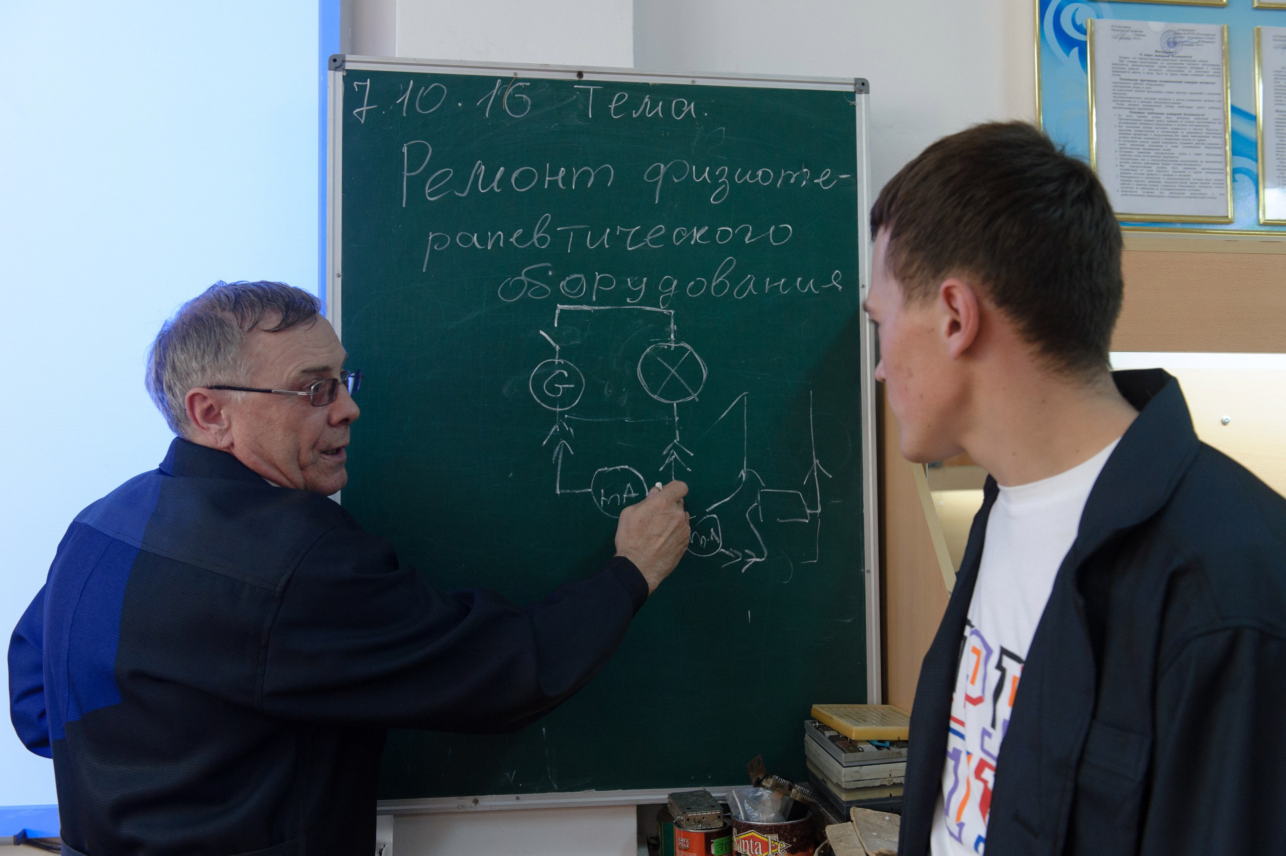 – Мы проходим всё, – говорит Николай Финк, мастер группы ЭМО. – Физиотерапевтическое, диагностическое, хирургическое оборудование. Ознакомительно даем рентгены и сосуды, работающие под давлением – автоклавы. Там отдельный допуск нужен. Сейчас вот студенты занимаются ремонтом физиотерапевтического оборудования. Вон аппарат «Стимул» стоит. Он для стимуляции мышц. В санатории такие есть.