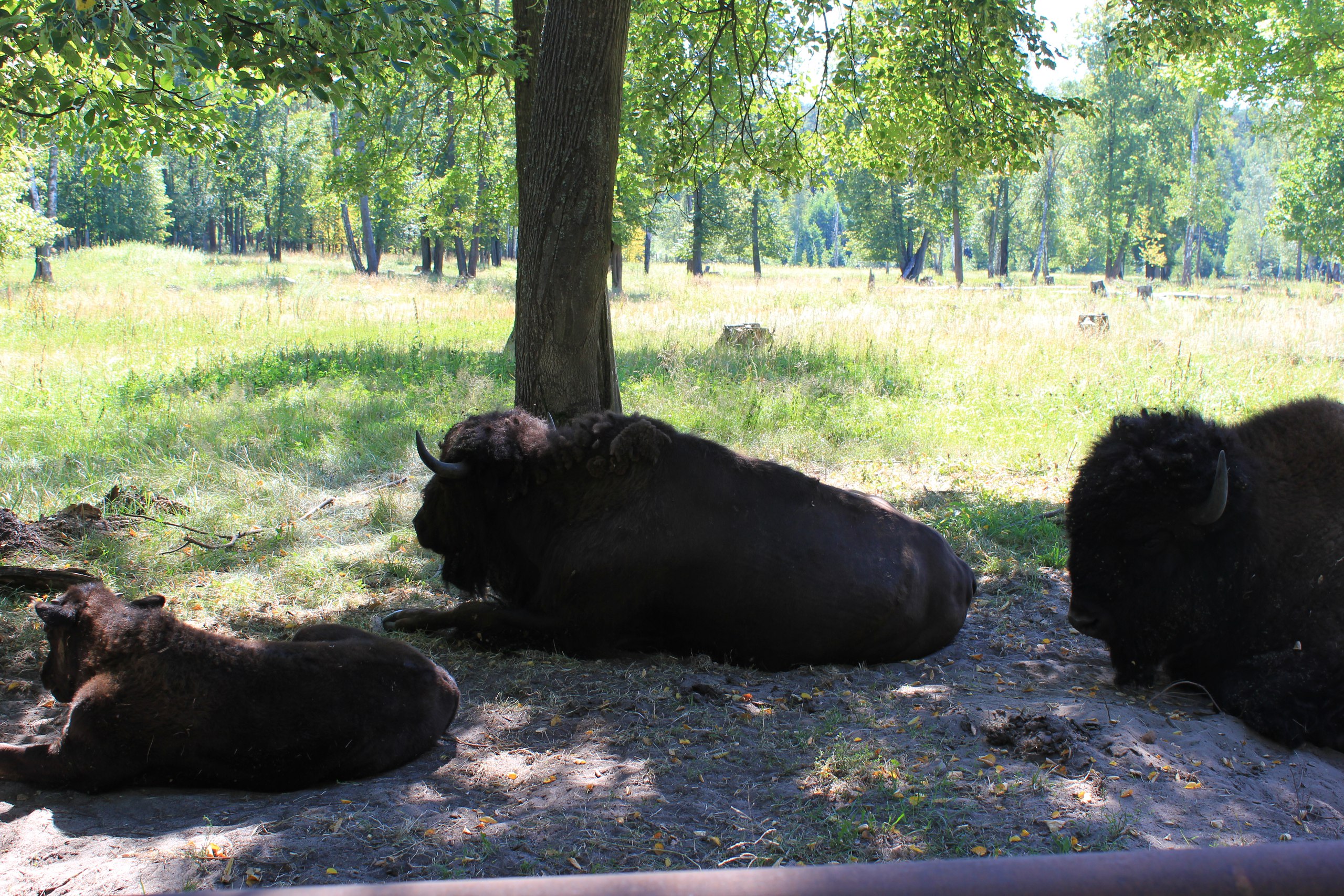 И в этот самый момент совсем близко мы увидели одинокого зубра, который укрылся от солнца в тени высоких деревьев. Потом встретили целое зубровое семейство, включая малышей. Телята жались к мамам, а папа-бык кувыркался в пыли. Где-то не очень высоко на глаза попался странного вида скворечник. Это не для птиц, пояснила провожатая, это для летучих мышей.