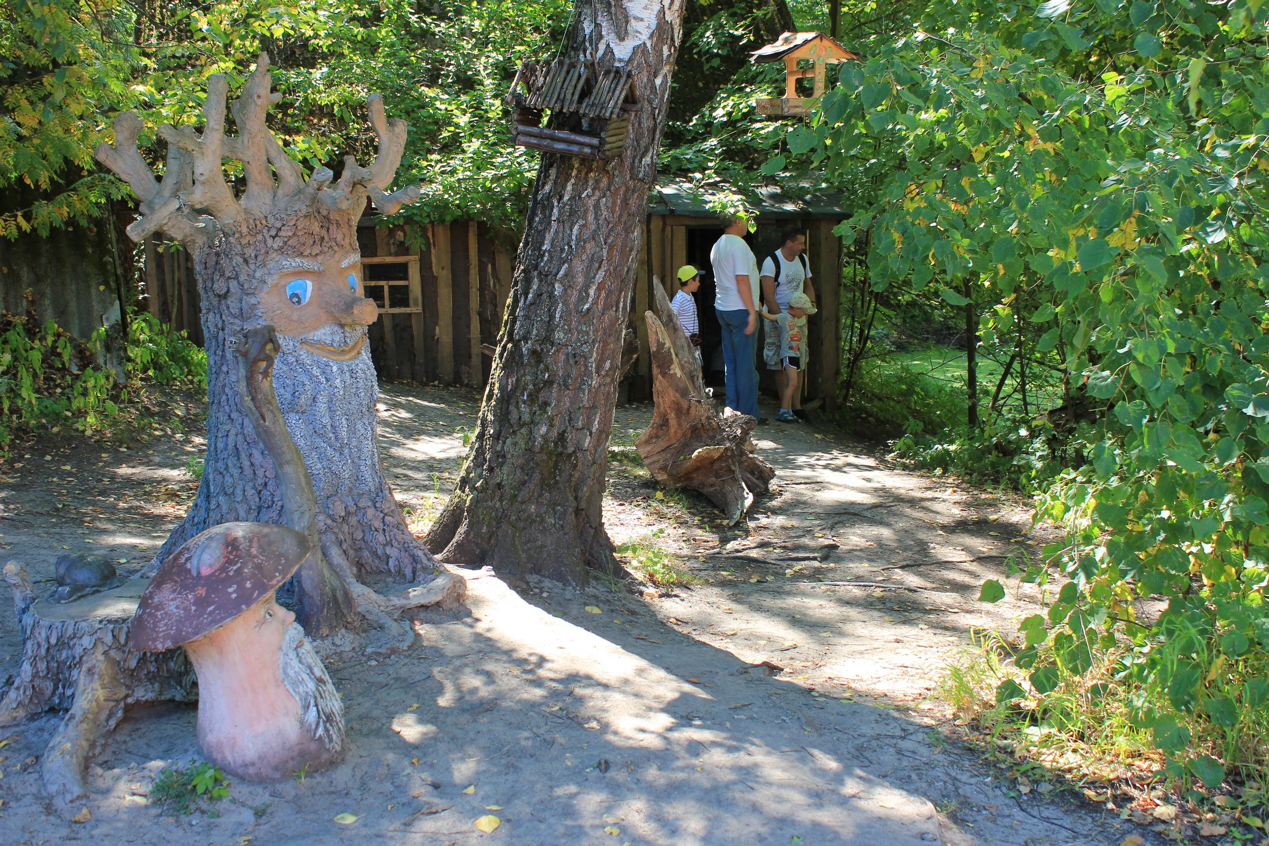 На выходе, само собой, масса сувениров, небольшой, но с любовью оформленный музей. Детей же притягивал домик лешего, который вроде бы охраняет здешние чащи. И собирал для памятных фото гипсовый зубр – к живому все равно ведь не подойдешь.
