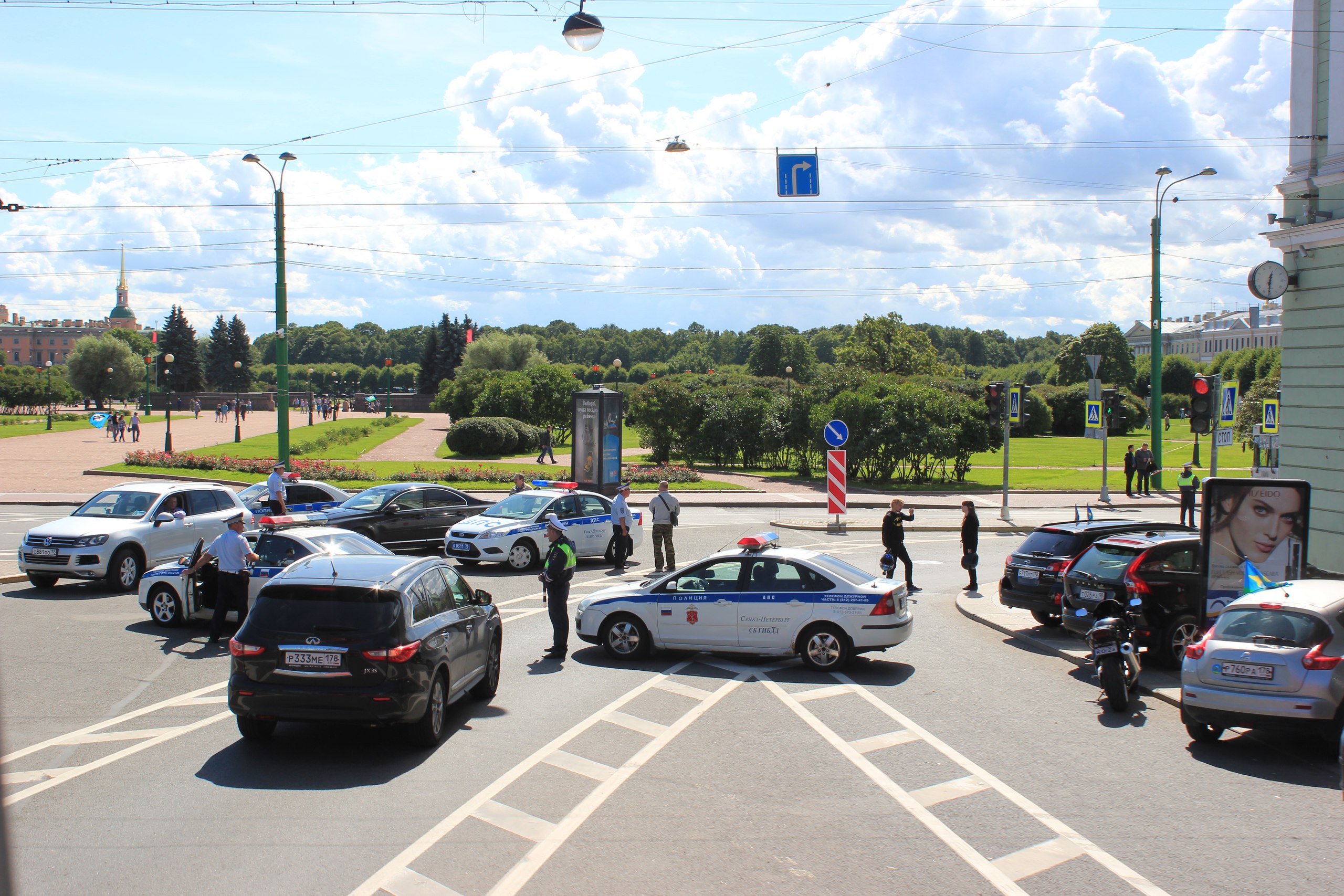 Что еще мы увидели из автобуса? Очень много. Даже простое перечисление всех красот я не рискую здесь приводить, не поместятся. Заметили, как сгущается атмосфера на улицах и площадях в ожидании грядущих гуляний бывших воинов ВДВ, их детей, подруг, друзей. Дворцовую площадь, Марсово поле, все узловые перекрестки оцепила полиция. А организаторы речных туров поспешили выдвинуть на первый план своих экзотических «капитанов», чтобы оторвать свой кусочек от праздника. Ну, кто не клюнет на экскурсию по Неве и каналам, которую ведет на чистейшем русском языке чернокожий парень в капитанской фуражке?