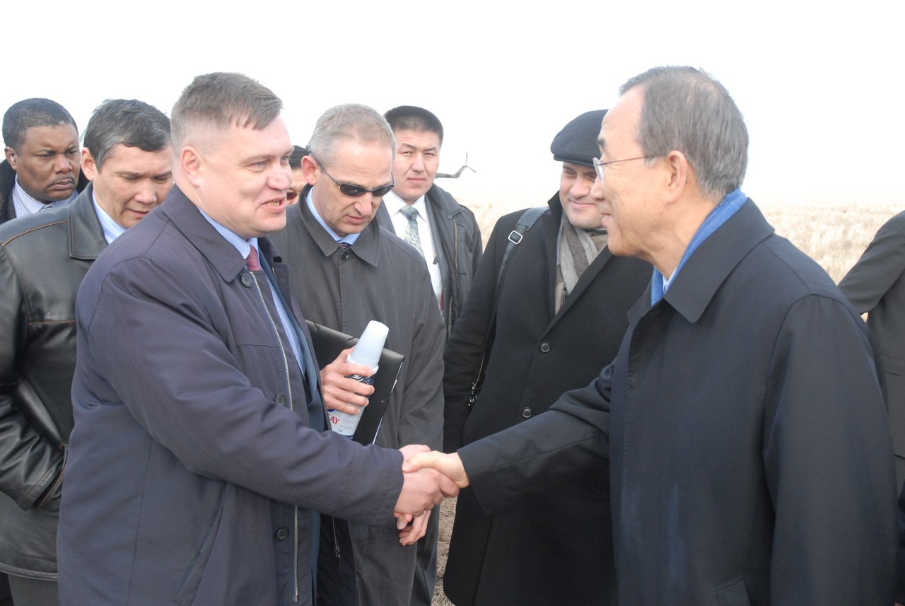 Камеры в ряд, негде протиснуться. Госсекретарь РК Саудабаев дарит Пан Ги Муну необычный сувенир — копию монумента «Сильнее смерти», установленного в Семее. Фигурка атома в композиции сделана из оплавленной земли, взятой в эпицентре одного из ядерных взрывов. Потом генсека приглашают в импровизированную юрту. Мы с Рустемом ждем заветного «эксклюзива». СОПовцы уже пытаются «рассовать» журналистов по вертолетам. Ждем пока Пан Ги Мун отвечает на вопросы Euronews. Потом главу ООН ведут к нам. И вот я жму ему руку. Он улыбается, а я думаю, ведь сейчас общаюсь с фактическим главой правительства нашей планеты.