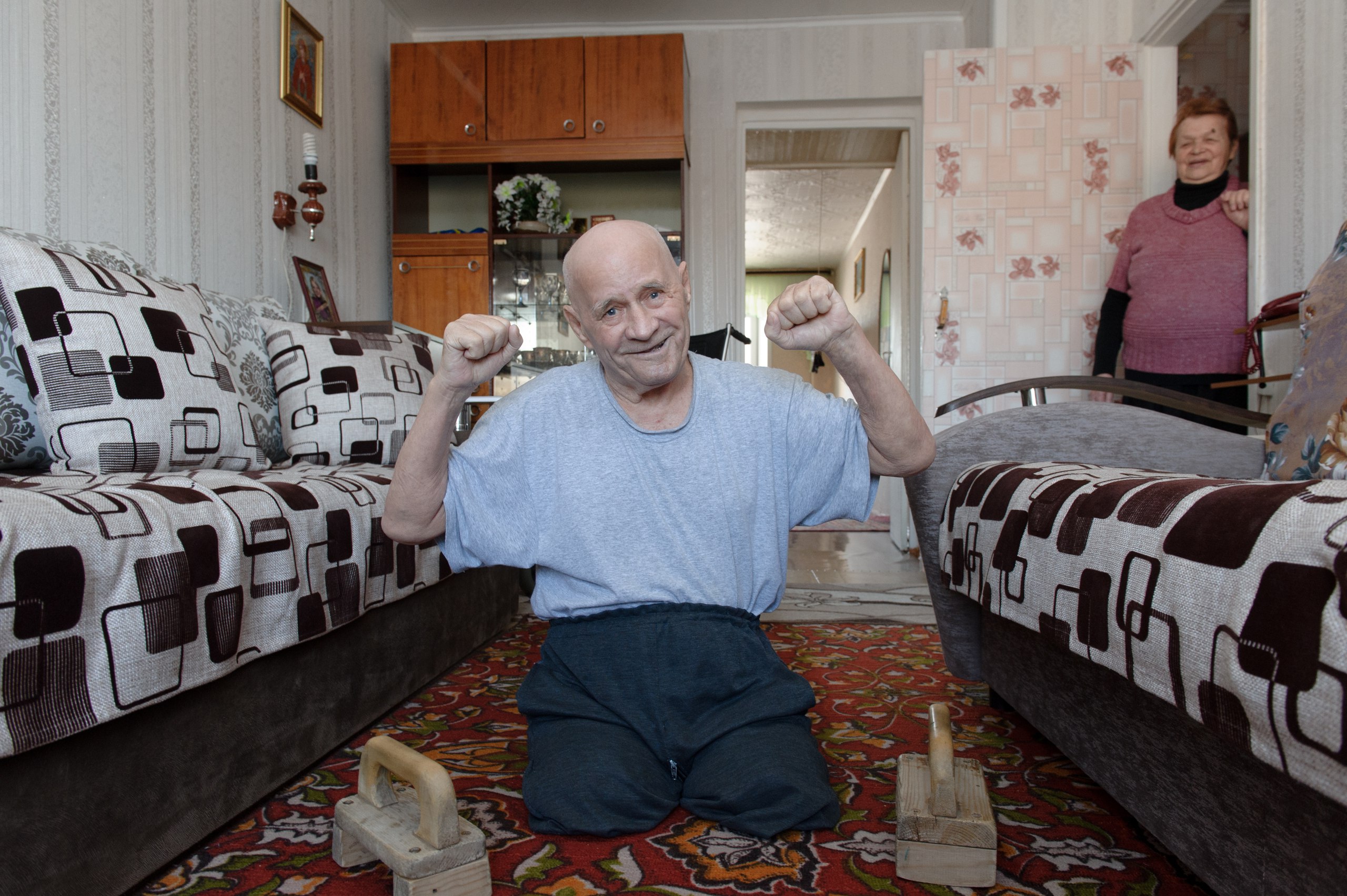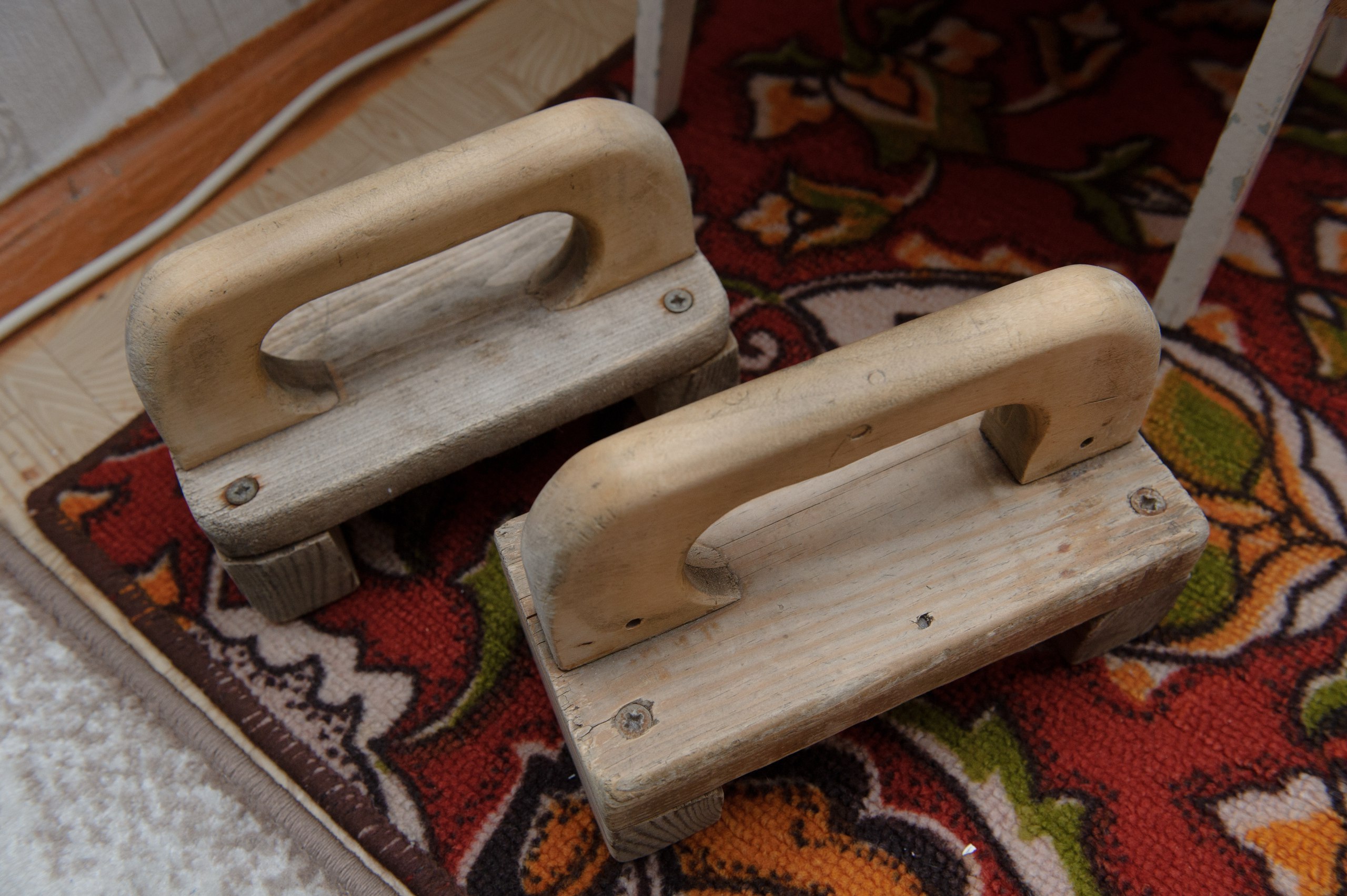 – Раньше я поднимал полуторалитровые бутылки с водой. Но сейчас уже тяжело. А это деревяшки – после войны у нас в деревне видел такие. И сразу сделал себе, когда случилось.