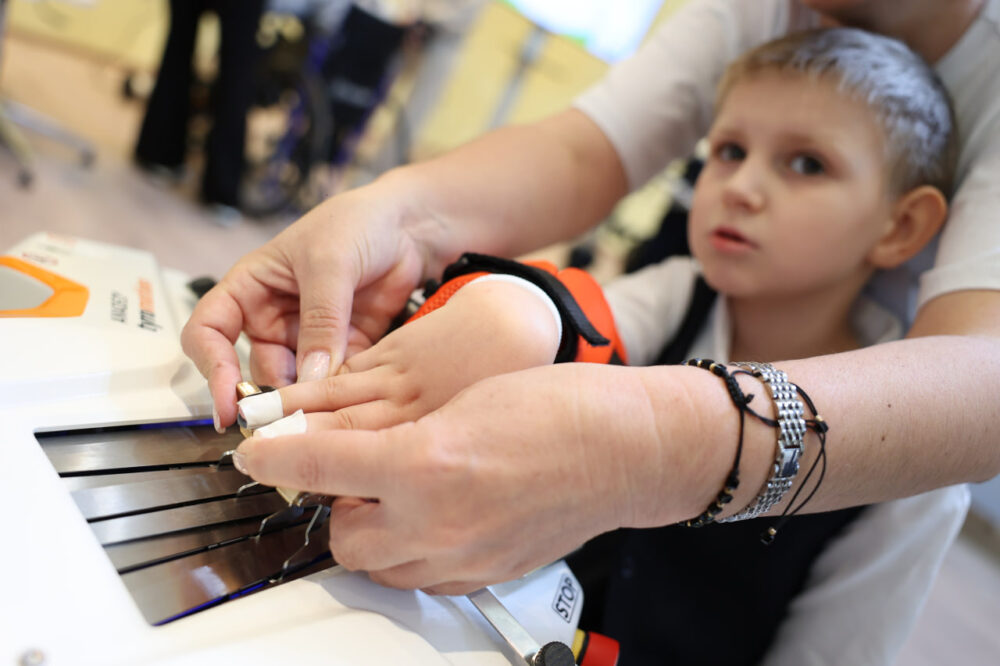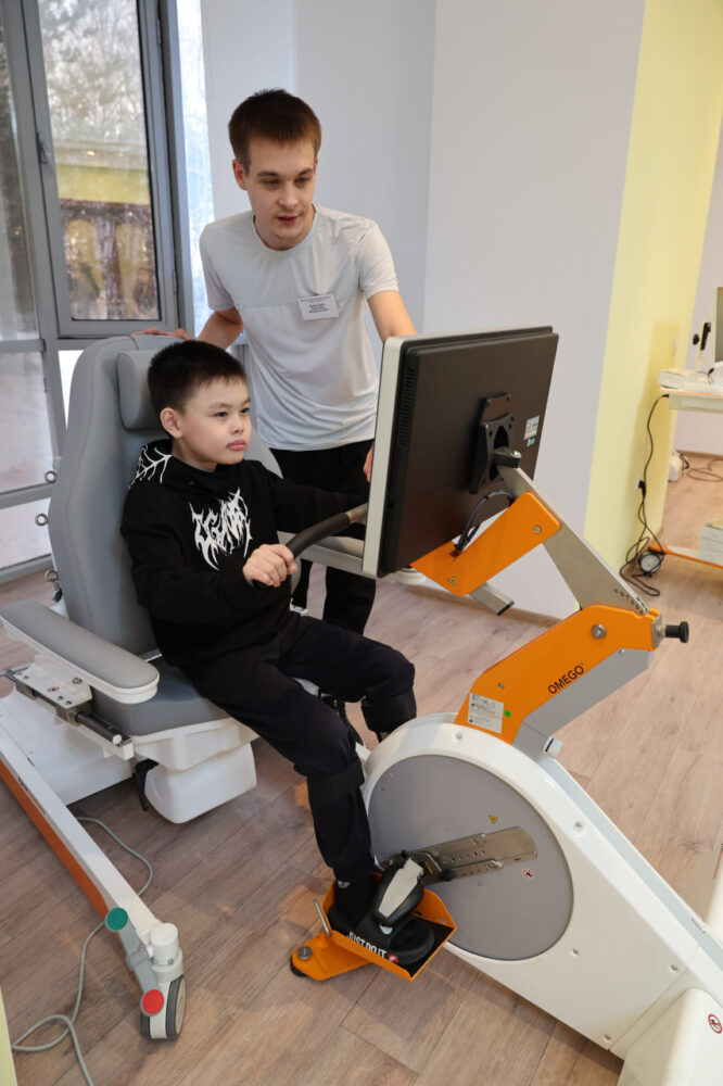 Даже велотренажер непростой. Кажется, что мальчик просто крутит педали. Подхожу ближе: на экране перед ним гонки. С помощью движений ног ребенок регулирует и маршрут своего авто.