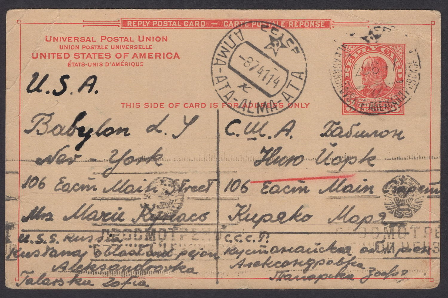 Получатель – Мари Киряко, проживающая по адресу 106 East Main Street в маленьком городишке Бабилон в штате НьюЙорк. Однако дошло ли письмо до адресата – неизвестно. Американского штемпеля на нем нет. Только целых два штампа «Просмотрено военной цензурой» и почтовый штемпель Алма-Аты от 8 июля. Из любопытного еще расшифровка отправителем аббревиатуры USSR – U.S.S.Russia.