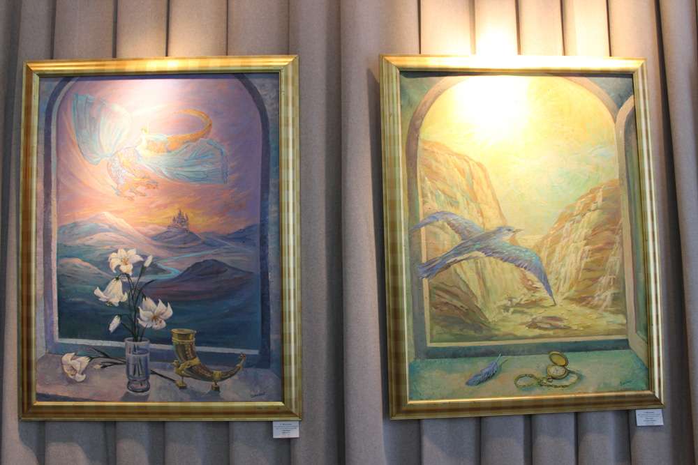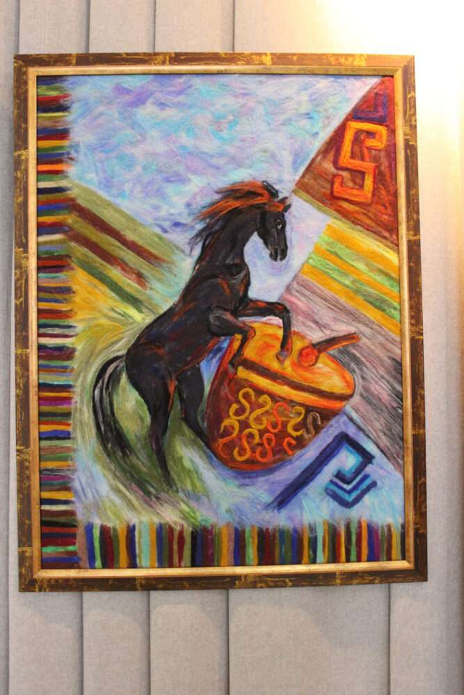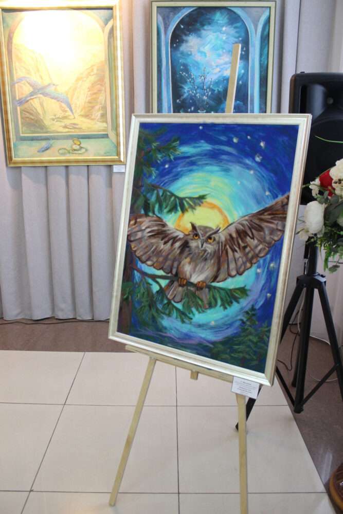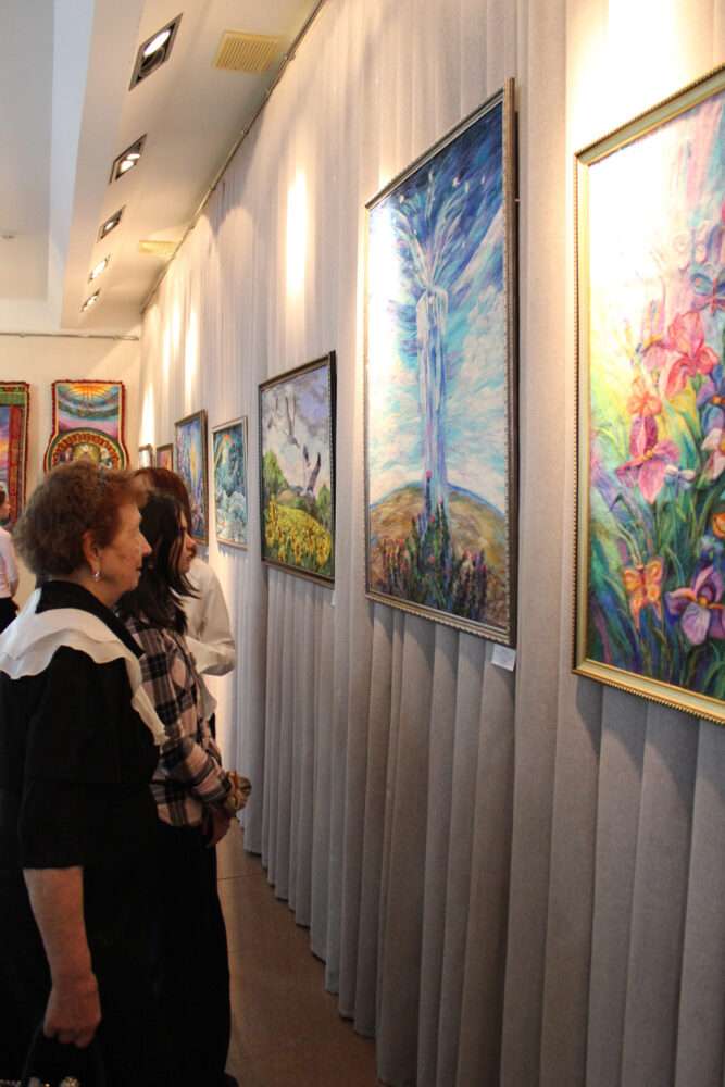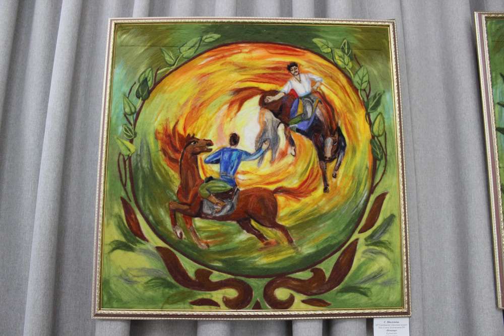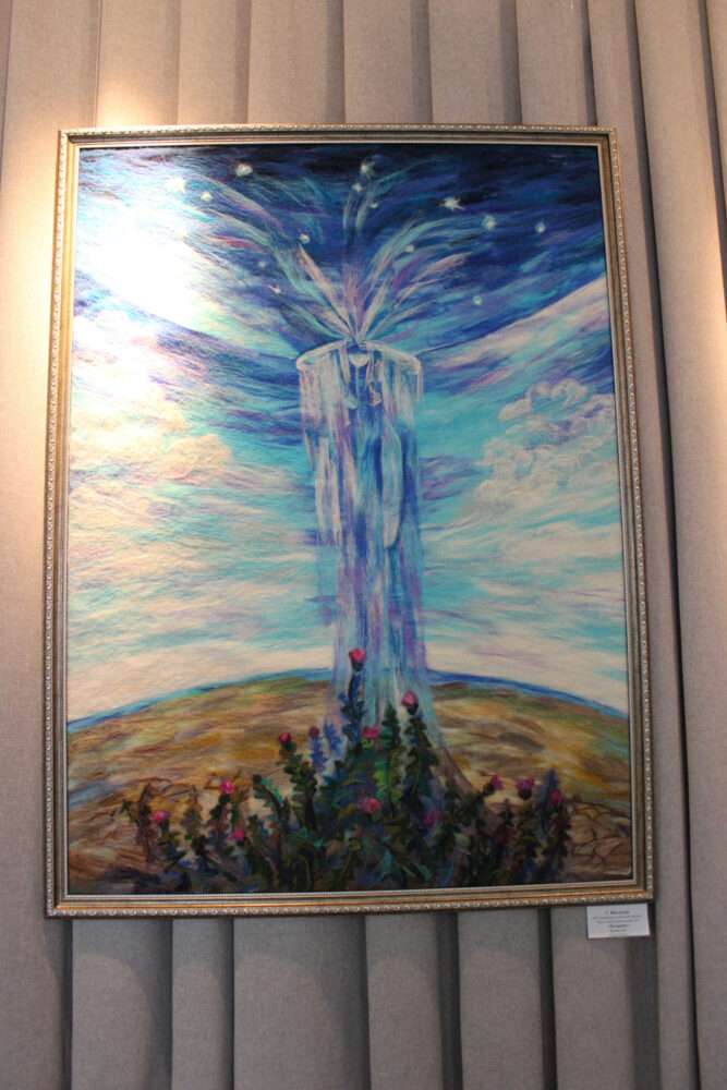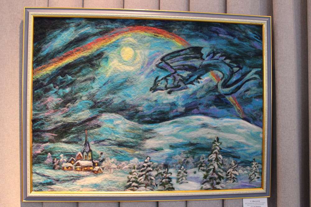 В Костанайской картинной галерее в этот раз представлено более 40 работ: масляная живопись, но в основном – сухой войлок, которым художник-прикладник увлечена последние годы. Тематика широкая: в пейзажах, натюрмортах, сюжетных композициях реальность легко переплетается с миром фантазии. Рядом с видами неповторимой природы, бытовыми сюжетами, в которых представлены детально национальные традиции, соседствует фантасмагория – дракон, на котором восседает красавица, расправил огромные крылья, над маленькой деревенькой на фоне луны пролетает мифическое чудовище… Страшно? Да нет.