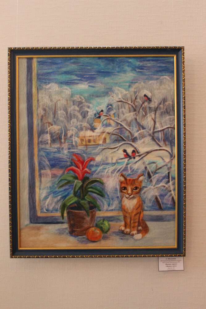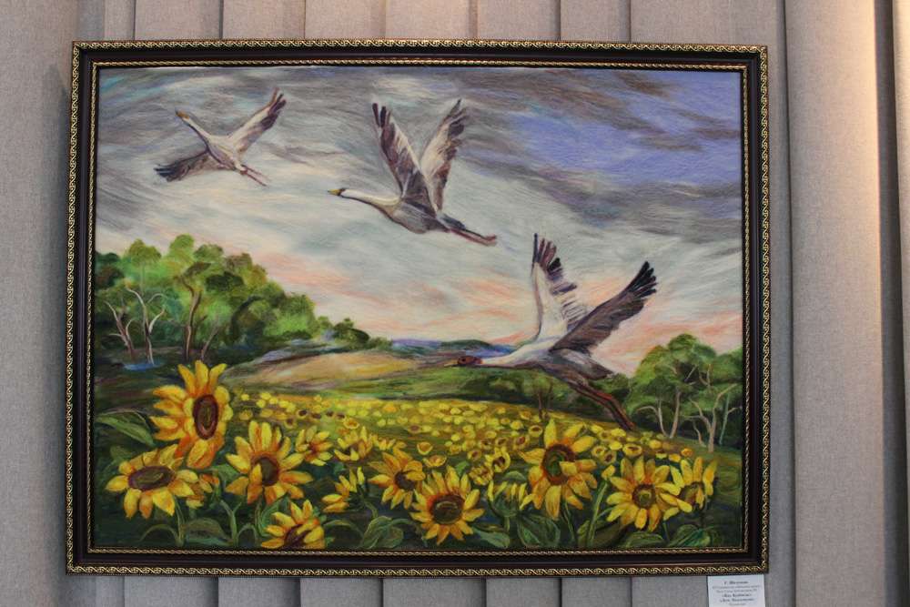 Ведь поблизости «Зимнее окно»: на подоконнике уселся рыжий котяра, который засматривается на уличных птиц. Здесь же «Доброе утро»: на фоне восходящего солнца разноцветный петух на зеленом лугу закукарекал, да так реалистично, что кажется, будто слышишь его. А с другой стороны «Лето. Подсолнухи»: над желтым полем взмывает в небо журавлиный клин. На душе становится теплее.