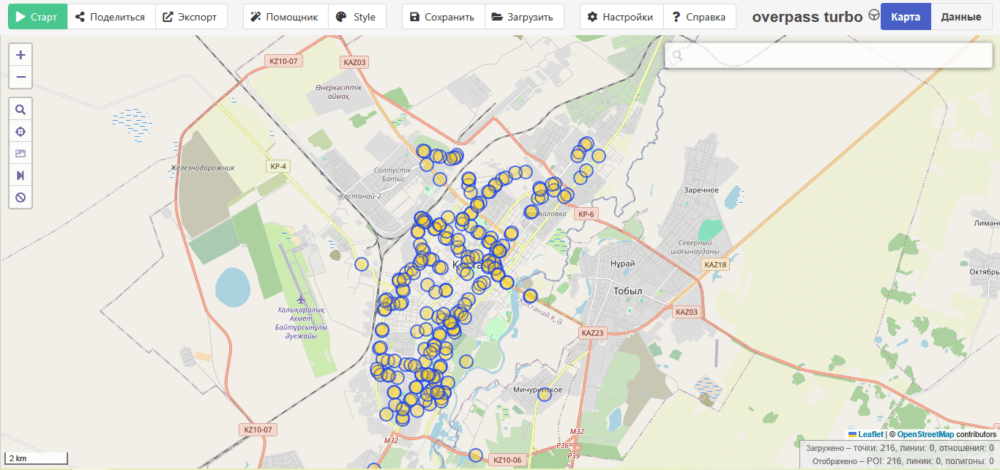 Автобусные маршруты – кровеносная система города. Если открыть Костанай в OpenStreetMap и «включить» все остановки, то станет прекрасно видно, насколько хорошо развито транспортное сообщение именно в длину. Костанай – линейный город. Река Тобол – наше русло расселения.