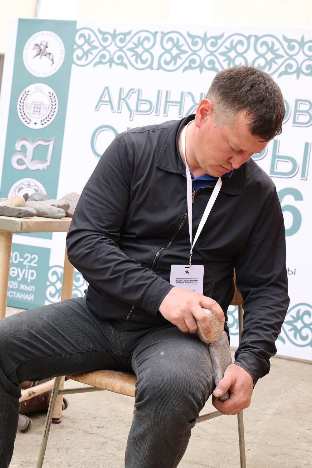 Практическую сторону археологии участники увидели на мастер-классе по экспериментальной обработке камня, который провел Канат Ескендиров, научный работник Института археологии А.Х. Маргулана.