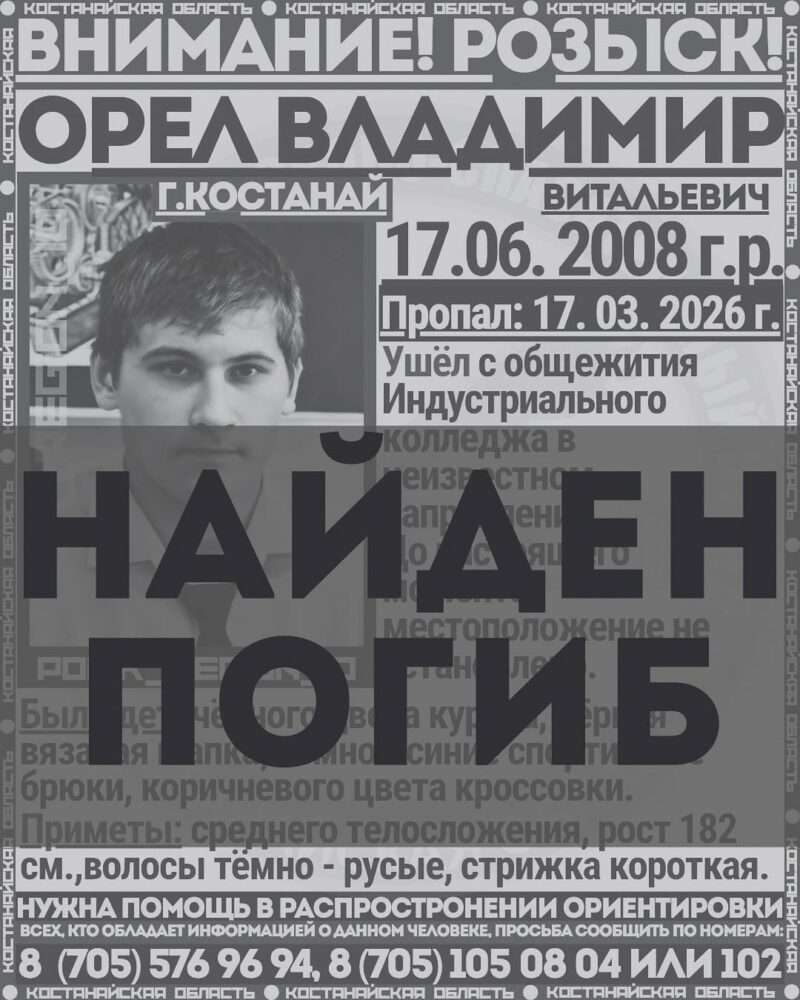 Напомним, студент пропал 17 марта — тогда появилась информация, что он ушёл из общежития Костанайского индустриально-педагогического колледжа в неизвестном направлении.