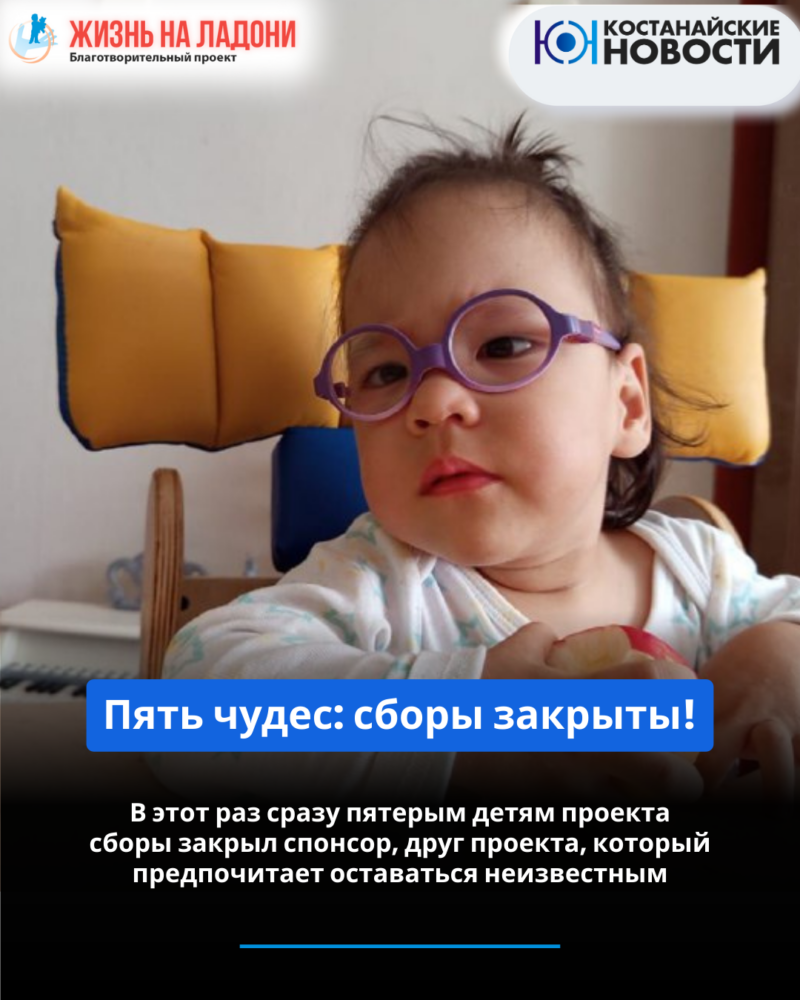В общей сложности спонсор перечислил пятерым детям 2 268 087 тенге: 426 517 для Темирлана Галиуллина (4 г., ДЦП), 392 579 тенге для Расула Сапабека (6 лет, ДЦП), 326 499 тенге для Дианы Садуовой (3 г., ДЦП), 940 000 для Дарии Кузбаковой (7 л., ДЦП) и 182 492 тенге для Томирис Жакиеновой (1 г. 4 мес., ДЦП). Всем этим детям мы вели сборы на реабилитацию. Теперь Темирлан, Расул и Дария получат возможность пройти ее в костанайском Центре коррекции и развития Taimas, а Томирис и Диана поедут в Турцию, в «Детский центр развития» (г. Измир).
