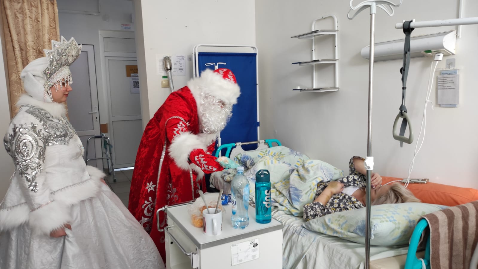 Дед Мороз с посохом и мешком вместе со Снегурочкой вручили пациентам маленькие подарочки, поздравив каждого с праздником. А их, на минуточку, 187 человек. В ответ – благодарные слова и видят улыбки от больных всех возрастов.